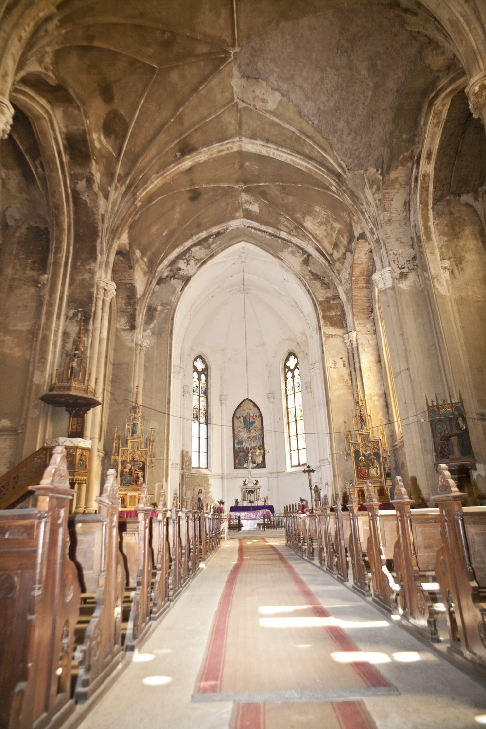Crkva je dekorisana vitražima koji se nalaze na svim većim prozorskim otvorima. Jedan deo njih je oštećen, a sačuvani su vitraži na apsidi, južnom i na severnom zidu crkve kao i na rozetama. Na vitražu u apsidi, predstavljeno je šest scena iz ciklusa Hristovog života, dok su na drugom, oštećenom vitražu sačuvane četiri scene iz Bogorodičinog ciklusa. Vitraže u apsidi su radili majstori iz Budimpešte 1912. godine. Na jednom vitražu je natpis sa imenima donatora, odnosno članova porodice Rubčič (Rubchich).